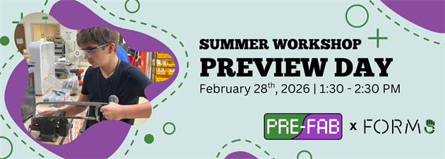 Form5’s PRE-FAB Summer Workshop is designed for students in 7th–9th grade who are curious about STEAM, creativity, and making a difference. This Preview Day gives families an inside look at the workshop before applying.